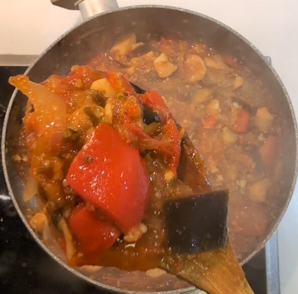 Agora, se desejar, você pode adicionar cogumelos previamente cozidos. Eu escolhi o cogumelo cardoncello por sua crocância particular. Misture tudo e adicione as especiarias que preferir. Cozinhe por cerca de meia hora em fogo alto, mexendo de vez em quando, para manter a crocância dos legumes. Se o molho secar muito, você pode adicionar caldo de legumes ou água do cozimento do macarrão.