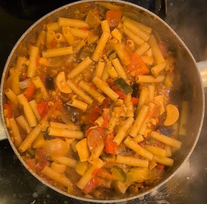 O macarrão com legumes está pronto para ser saboreado quente ou frio, como salada de macarrão. Eu o servi assim, sem adicionar mais nada, mas se você quiser pode adicionar ricota defumada ralada na hora. É um toque extra de sabor, que o torna ainda mais delicioso.