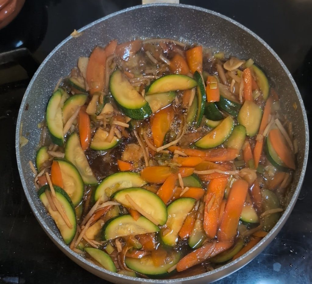 • Agora adicionamos as abobrinhas e continuamos a cozinhar em fogo médio-baixo. Mexemos de vez em quando para evitar que os vegetais queimem. Se necessário, podemos adicionar um pouco de água quente para facilitar o cozimento. As abobrinhas estarão prontas quando mudarem de consistência e ficarem macias, mas ainda crocantes.