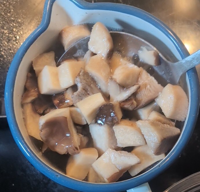 Antes de prosseguir, é necessário ferver os cogumelos em água salgada por alguns minutos. Imersamos completamente os cogumelos na água fervente e deixamos cozinhar por 5 minutos a partir do momento em que a água volta a ferver. Neste ponto, os cogumelos estão prontos para serem usados na receita.