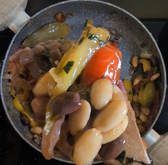 Deixe descansar os pimentões na frigideira com azeitonas, alcaparras e amêndoas por cerca de 10 minutos, com o fogo desligado e a tampa fechada. Desta forma, o vapor que se formará ajudará a extrair os aromas dos pimentões e de outros vegetais, tornando-os mais saborosos e apetitosos.