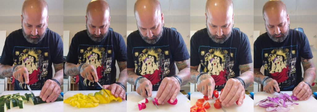 Lave e corte em cubos pequenos o pepino, os pimentões amarelos, os tomatinhos e a cebola (se você usar).