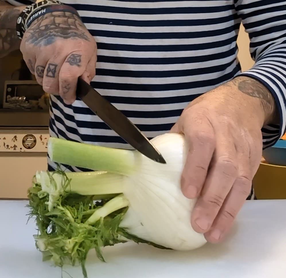 Comece cortando a erva-doce, reservando a parte externa e o talo. Se estiverem limpos e sem impurezas, também usaremos estas partes, proporcionando um toque extra de sabor à salada.