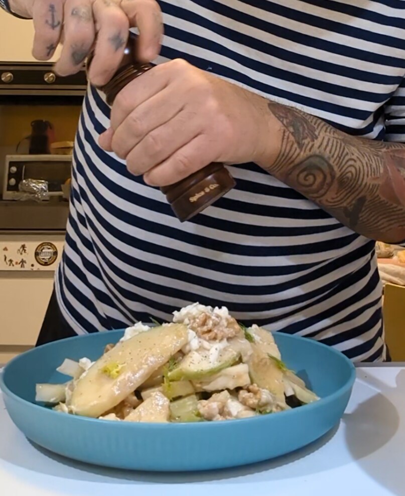 Emprate com cuidado e adicione mais uma pitada de pimenta preta para um toque final de sabor. Agora, aproveite sua criação culinária! A salada de erva-doce, maçã, nozes e gorgonzola está pronta.