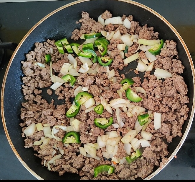 Assim que a carne moída mudar de cor, retiro o alho e adiciono a cebola e a pimenta jalapeño picadas e deixo saborizar por um minuto.