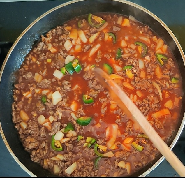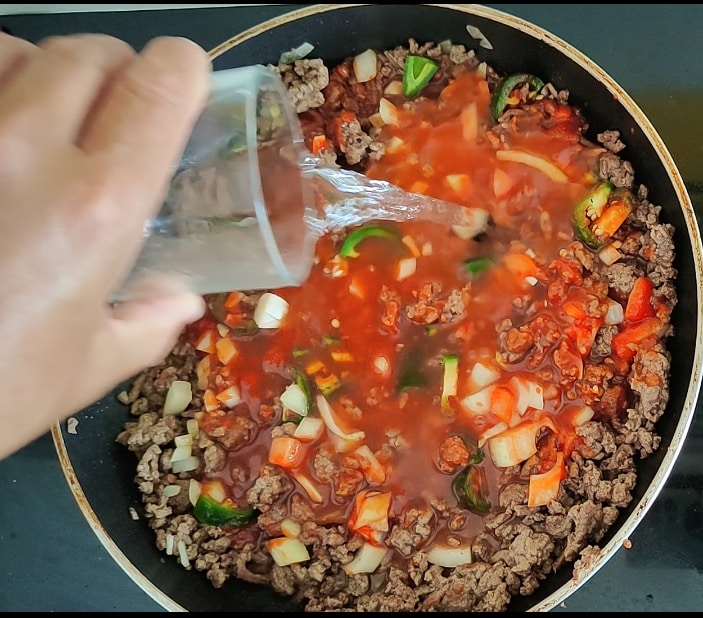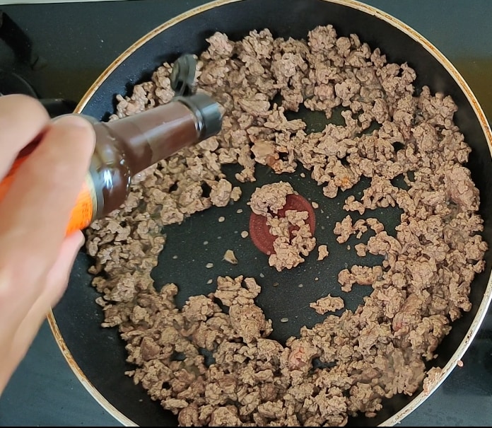 Em seguida, adiciono a carne moída de boi triturada e deixo saborizar no refogado.