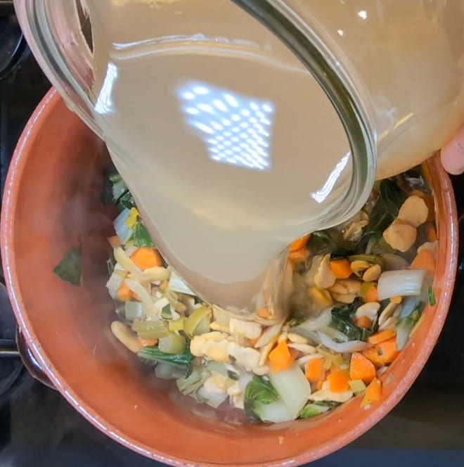 Então, depois de refogar os vegetais com o vinho branco, adicionamos as acelgas e as favas secas. Cobrimos tudo abundantemente com o caldo de legumes quente e levamos à fervura.