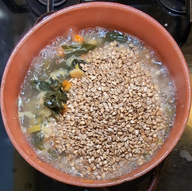 Logo que o caldo atinge a fervura, adicionamos a cevada e as favas, que têm tempos de cozimento semelhantes, e deixamos ferver em fogo baixo por cerca de 60 minutos, ou até que a cevada e as favas estejam bem cozidas.
