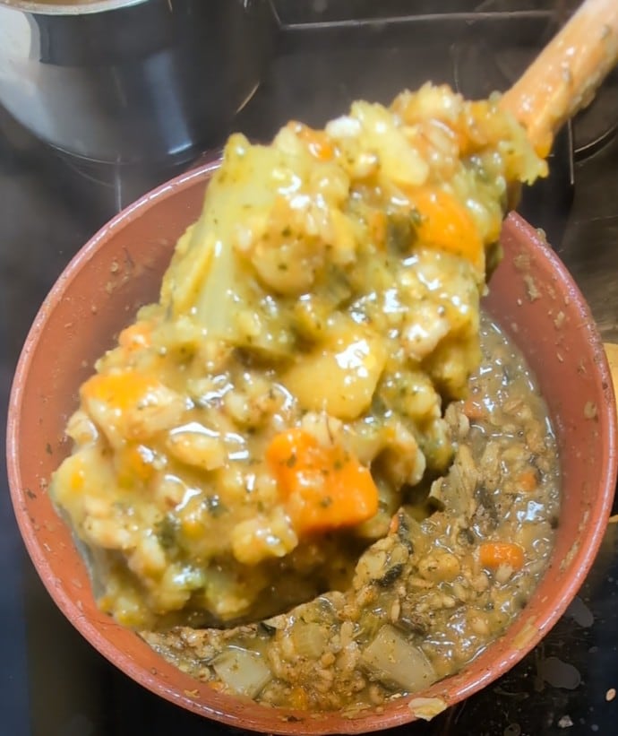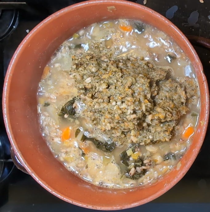 Além disso, ao bater a cevada junto com as favas, a sopa pode ficar mais densa e aquosa. Deixando a cevada em pedaços, mantém-se uma certa consistência e evita que a sopa fique muito seca.