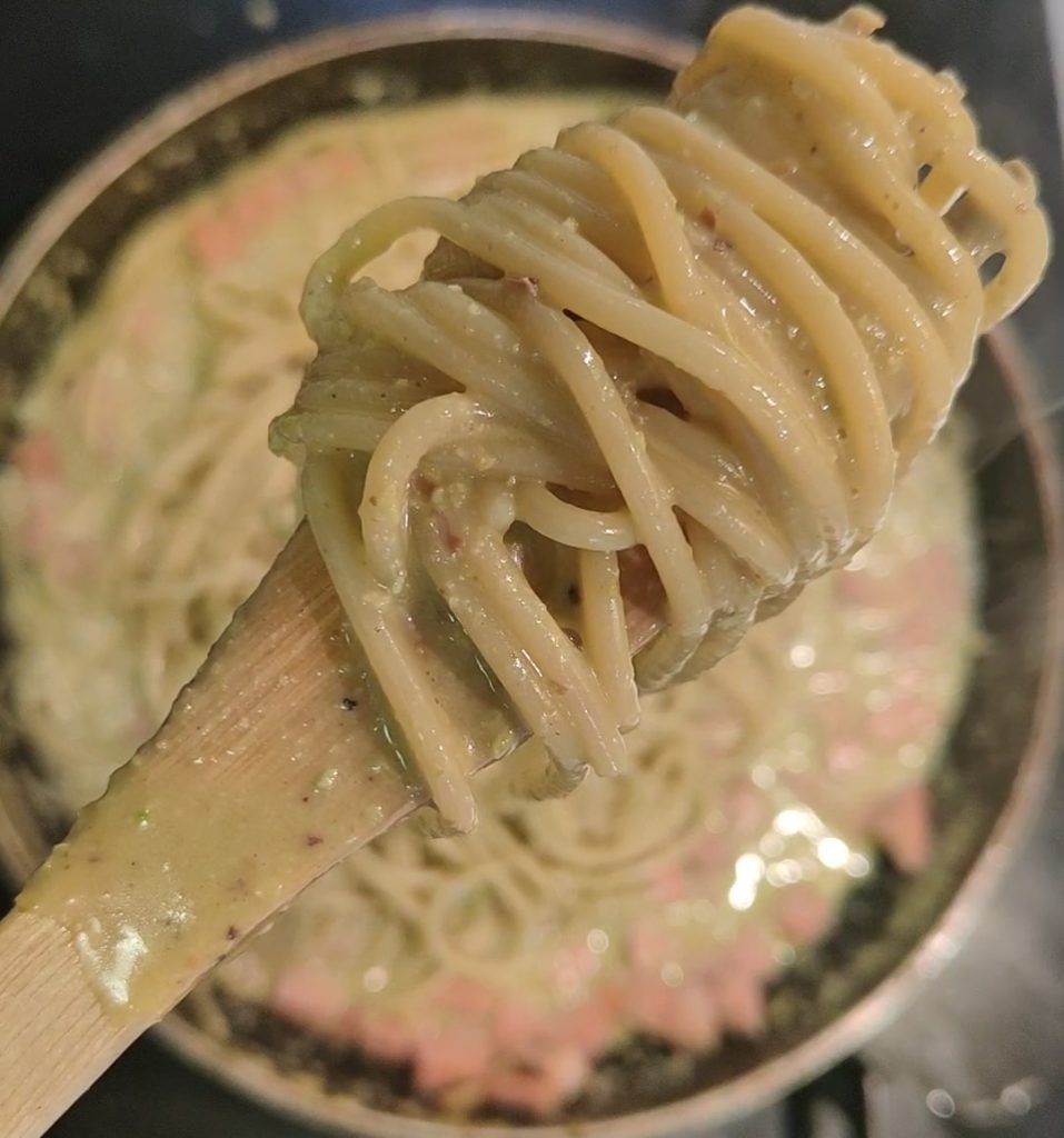 Ao mesmo tempo, ainda com o fogo desligado, fazemos pular o espaguete para misturar bem todos os ingredientes e garantir que a massa fique bem temperada e muito cremosa.
