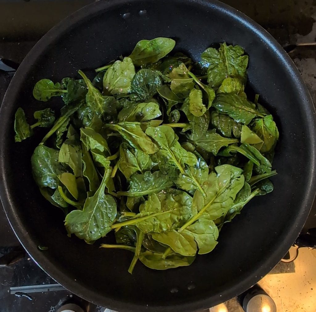 Nesse ponto, juntamos os espinafres ao presunto e mexemos delicadamente para amalgamar os sabores. Ajustamos o sal e adicionamos uma pitada de pimenta-do-reino moída na hora.