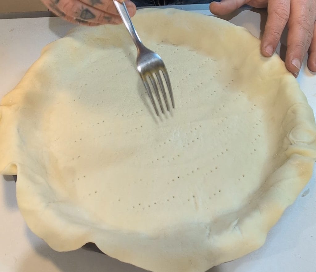 Perfure a base da massa com um garfo antes de adicionar o recheio. Isso permitirá que o vapor escape durante o cozimento, evitando que a massa fique encharcada.