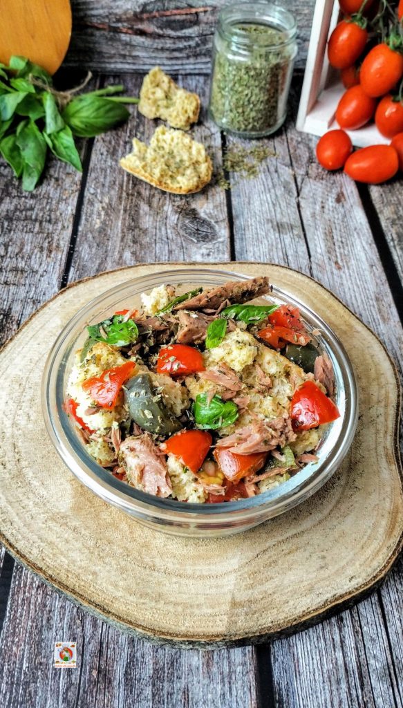 Enquanto preparo os ingredientes, fico intrigada com a consistência rústica e crocante do pão biscoitado, combinada com os tomatinhos doces e suculentos e a salinidade do atum. A adição de orégano e manjericão enriquece ainda mais o prato, criando uma explosão de sabores mediterrâneos.