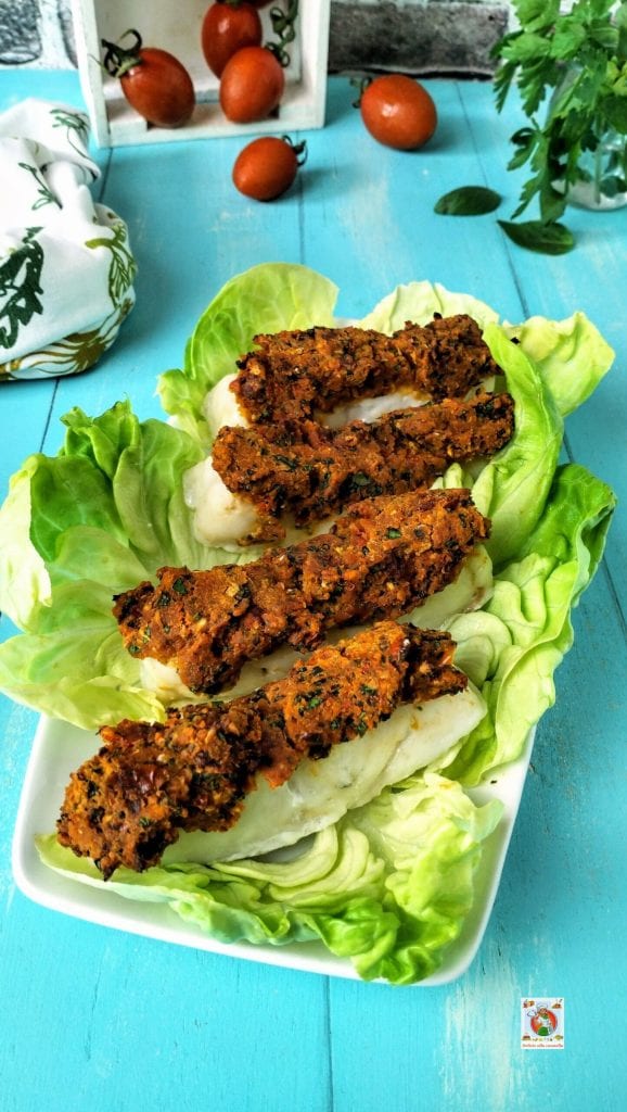 Os filés de bacalhau, tenros e delicados, são a base perfeita para esta receita. Cada mordida oferece uma textura suculenta, que combina perfeitamente com a crocância da cobertura. O gratinado é feito batendo fatias de pão de forma, que conferem uma crocância saborosa, enriquecida pelo sabor intenso dos tomates secos. Esses pequenos tesouros vermelhos adicionam um toque de doçura e acidez, equilibrando perfeitamente o prato. Para completar esta obra-prima, há os tomatinhos frescos, cujo sabor levemente ácido combina harmoniosamente com o alho, a salsinha fresca e o manjericão perfumado. Juntos, eles criam uma sinfonia de sabores que explode na boca a cada mordida.