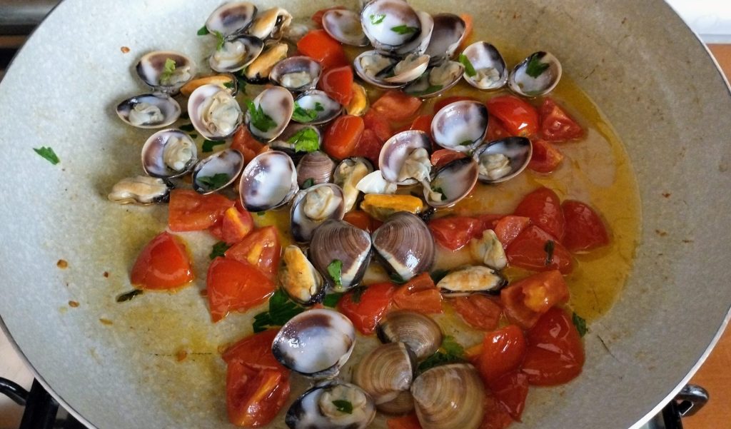 Os mexilhões, com seu sabor forte e intenso, combinam perfeitamente com a delicadeza das amêijoas, criando um equilíbrio perfeito que é realçado pela doçura e acidez dos tomatinhos. Os mexilhões e as amêijoas fresquíssimos, escolhidos com atenção no mercado de confiança, estão prontos para serem limpos e cozidos. O aroma do alho dourando no azeite de oliva extravirgem enche a cozinha. Quando os mexilhões e as amêijoas começam a se abrir, liberando seu líquido saboroso, você sabe que o coração do prato está tomando forma.