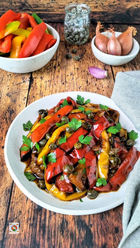 Você pode servir os pimentões com alcaparras e vinagre balsâmico quentes ou mornos.