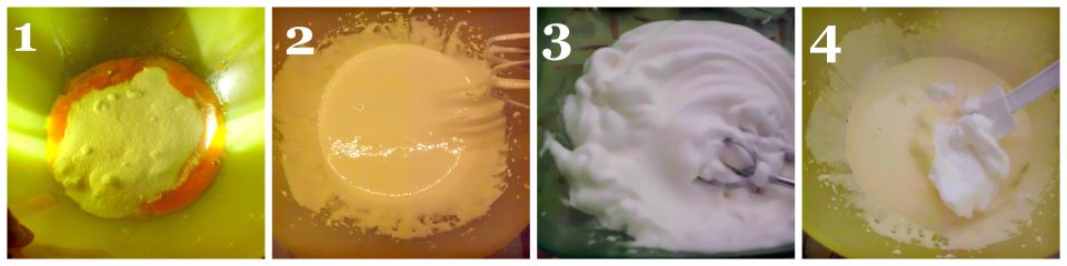 À parte, bata as claras com uma pitada de sal, em neve firme (3) e, incorpore-as, aos poucos, às gemas (com o máximo de delicadeza) (4).