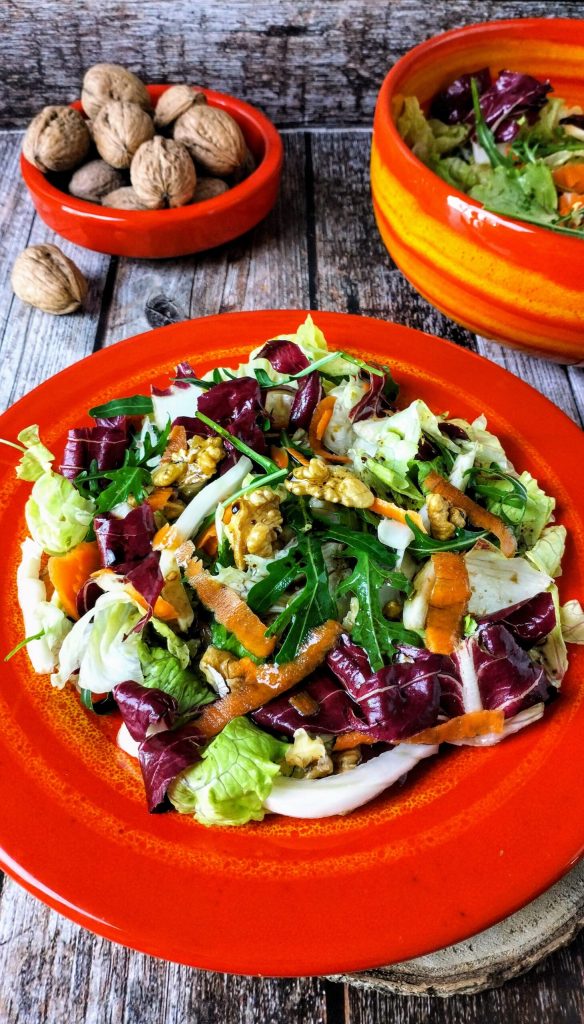 Esta salada mista com nozes é facílima de preparar e pode ser personalizada com os ingredientes que você preferir. Você pode adicionar queijo, como feta ou pecorino, para um sabor ainda mais intenso. Você pode temperá-la apenas com azeite extravirgem ou, como eu fiz, fazer uma emulsão com azeite e vinagre balsâmico.