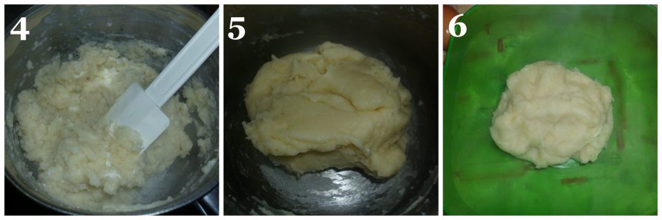 Misture os ingredientes, mexendo rapidamente com uma espátula (4). Quando a massa engrossar (5), cozinhe ainda até que ela desgrude das paredes da panela e se forme uma película branca no fundo (6).