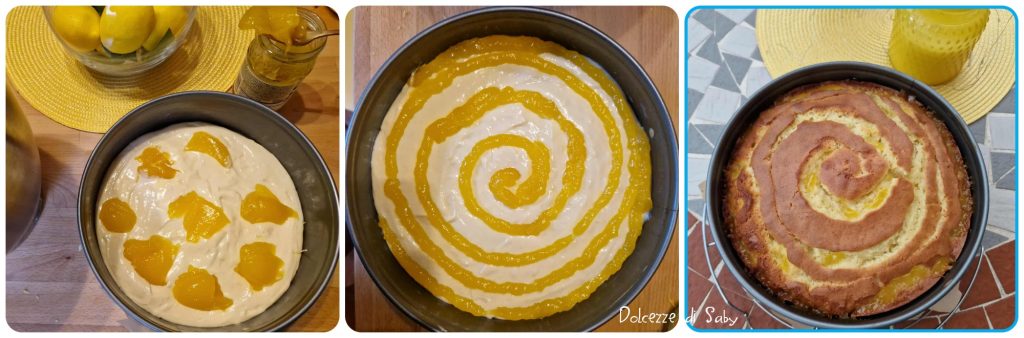 Despeje agora a massa restante, nivele e, se quiser, coloque o lemon curd em um saco de confeitar e faça decorações na superfície do bolo. Fiz uma espiral, por exemplo, mas você pode usar sua criatividade para decorar.