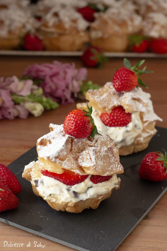 Hoje quero propor a vocês uma sobremesa siciliana chamada cabeças de turco e cabeças de mouro. Diz-se que foi preparada após uma batalha entre Normandos e os Sarracenos, e a sobremesa nasceu justamente para lembrar o turbante destes últimos. Trata-se dos grandes Bombas recheados com ricota aos quais eu também adicionei morangos. Admito que o creme é o dos cannoli sicilianos, mas a combinação com os morangos torna essas cabeças de turvo ainda mais especiais, frescas e deliciosas. A receita dos meus bombas você pode encontrar AQUI ou, se tiver pouco tempo, pode comprá-los já prontos.