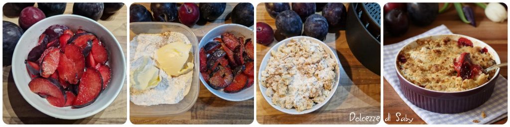 Numa tigela coloque a farinha, o açúcar (eu uso adoçante), a manteiga em pedaços e uma colher de chá de canela. Com as mãos comece a “amassar” até formar grumos — fique tranquilo se eles tiverem tamanhos diferentes. Nesse momento distribua os grumos sobre as ameixas e seu crumble está pronto para ir ao forno a 180°C por cerca de 20 minutos no modo estático. Passado esse tempo, ligue o grill, aumente a temperatura para 200°C e deixe por mais uns 5-10 minutos para que a superfície fique bem dourada.
