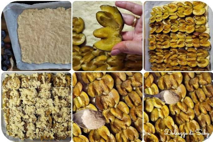 Enquanto isso, lave as ameixas e corte-as como você vê na segunda foto, removendo o caroço de cada uma. Então dedique-se à preparação da farofa: derreta a manteiga e despeje-a em uma tigela onde você já colocou a farinha e o açúcar. Com as mãos, comece a amassar até obter pequenas farofas.