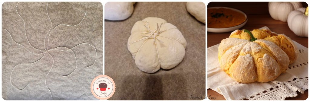 Em uma tigela misture as duas farinhas, à parte dissolva o fermento em um pouco de água e despeje sobre a farinha, comece a amassar adicionando o restante da água e por último o sal. Quando todos os ingredientes estiverem bem incorporados, abra a massa e adicione o purê de abóbora, amasse mais um minuto para que tudo fique homogêneo e compacto. Eu recomendo a batedeira planetária porque a massa ficará bastante mole, mas se quiser pode também amassar com as mãos. Agora despeje a massa em uma tigela e deixe crescer até dobrar de tamanho, levará cerca de 2 horas. Neste ponto, forre uma assadeira com papel manteiga, pegue um barbante de cozinha e corte 5 pedaços de cerca de 20 cm e cruze-os fazendo a forma de uma estrela, pincele o barbante com óleo. Faça essa operação 2 vezes porque obterá 2 pãezinhos.