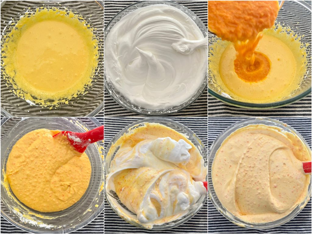 Por último, adicione as claras em neve, mexendo delicadamente para não desmontar.