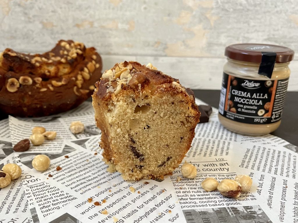 É um bolo macio e úmido que se derrete na boca a cada mordida com um sabor intenso de avelã.