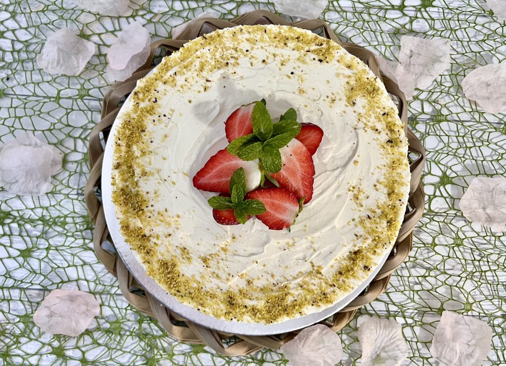 Cheesecake de chocolate branco, pistache e framboesas, uma combinação irresistível de sabores que vai te conquistar na primeira mordida!