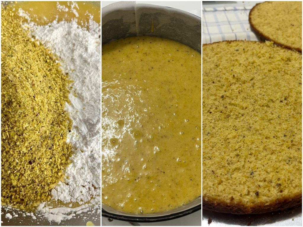 Primeiro, prepare a base de blondies de pistache com uma forma de 22 cm de diâmetro, para o procedimento clique aqui Blondies de Pistache sem glúten.