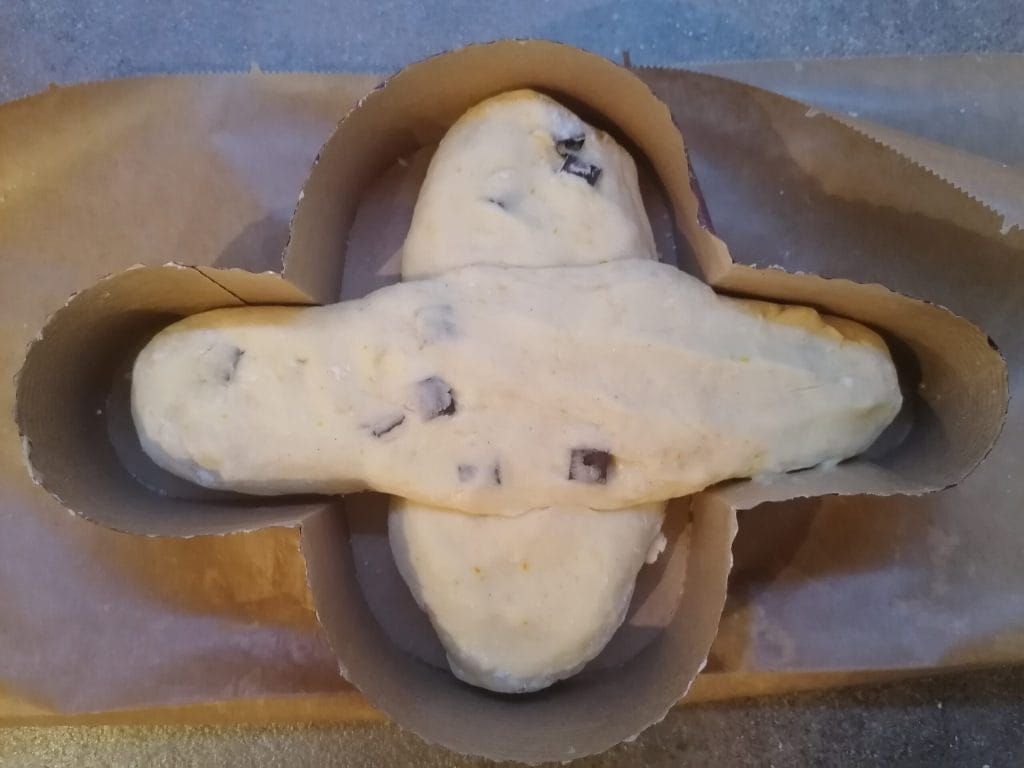 • Despeje a massa em uma superfície enfarinhada com fécula de batata, adicione as gotas de chocolate amassando à mão e forme uma bola (modelagem). Divida em duas e modele novamente. Estenda ambas para formar dois cilindros e coloque-os na forma de colomba cruzando-os e pressionando levemente no ponto de cruzamento.