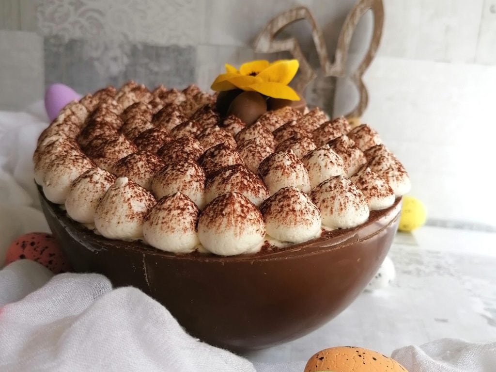 Metade de um ovo de chocolate ao leite recheado com tiras de pão-de-ló embebidas em café e um creme tão simples quanto delicioso que faz todo mundo enlouquecer por aqui, creme de leite fresco e leite condensado 😋
