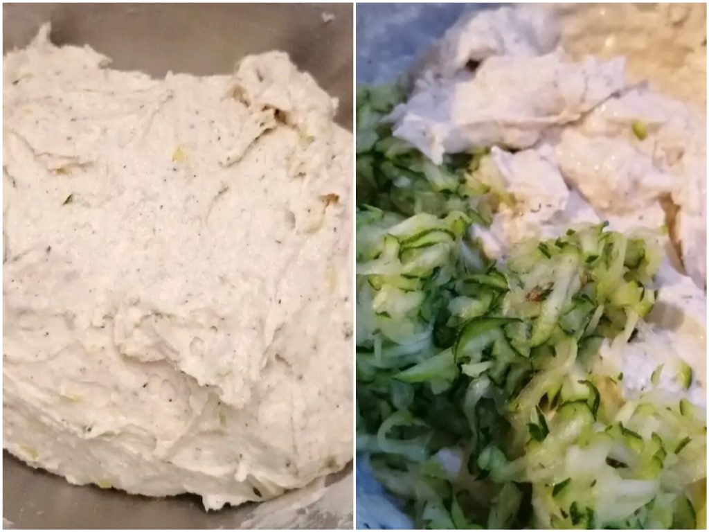 Na tigela da batedeira, coloque a farinha, ligue e comece a adicionar água e a água com o fermento. Depois de alguns minutos, adicione o sal e as abobrinhas depois de espremer.