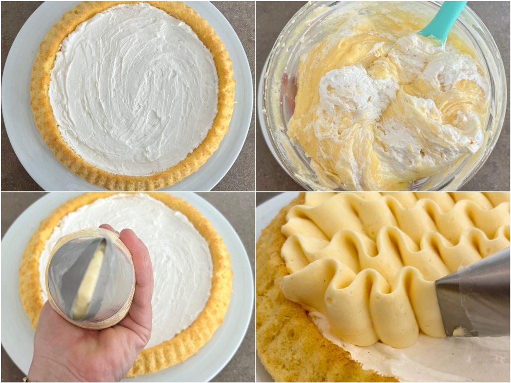 Para o recheio, uma camada dupla, uma de chantilly aromatizado com baunilha e uma de creme diplomata.