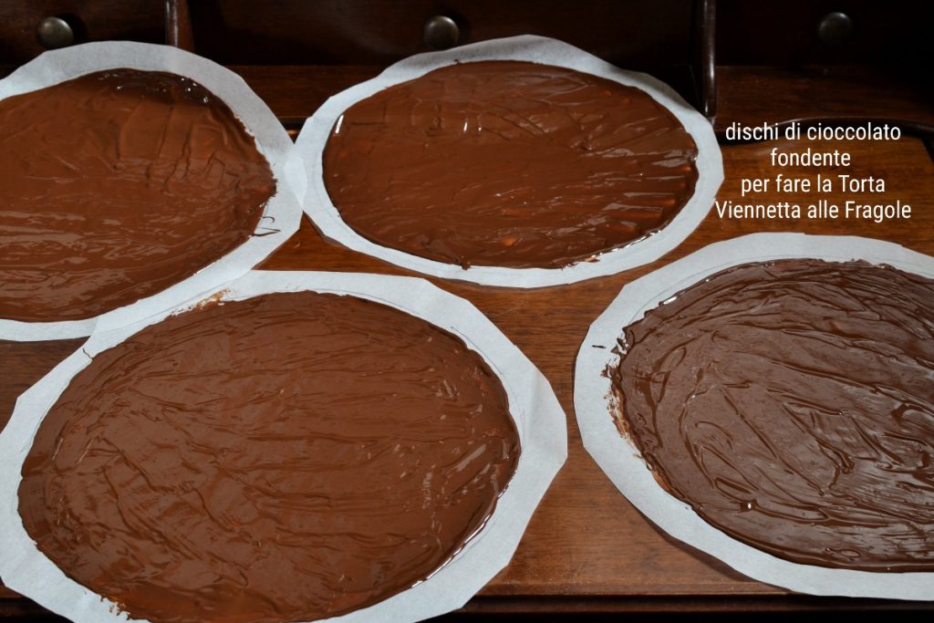 Derreta 150 g de chocolate amargo no micro-ondas ou em banho-maria. Com esse chocolate faça 4 a 5 discos (25 cm de diâmetro), finos — cada disco fica com cerca de 25–30 g de chocolate derretido — sobre papel manteiga (desenhe antes com uma caneta). Coloque-os no congelador (vai bem colocar um de cada vez, bastando 1 minuto antes de usar).