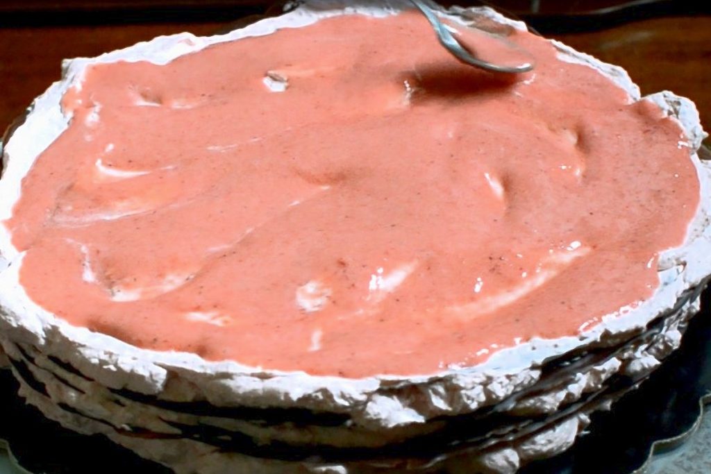 Por fim, cubra o último andar com aquela meia xícara bem cheia de morangos batidos que foi deixada de lado.