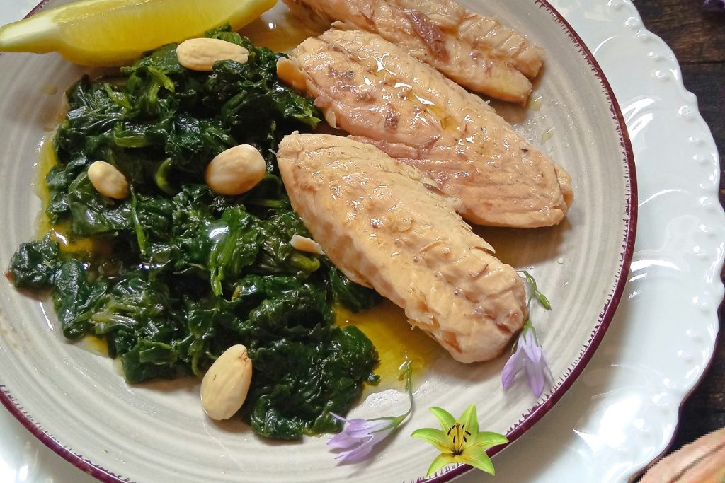 Quando o espinafre estiver cozido, transfira para um prato, acrescente 80 g de cavala e 20 g de amêndoas.