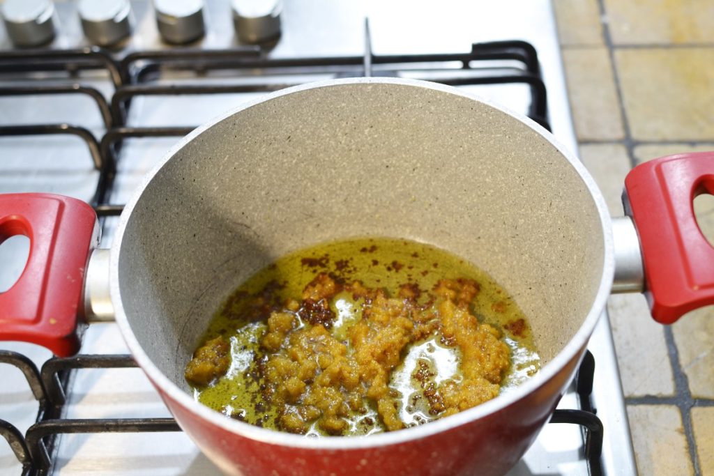 • Coloque 2 colheres de azeite na panela acenda o fogão e adicione 3 – 4 cubos de caldo vegetal caseiro (ou 30 g de aipo, 30 g de cenoura, 30 g de cebola, tudo passado diretamente no moedor antes do polvo, ou você pode usar um processador de alimentos com lâminas).