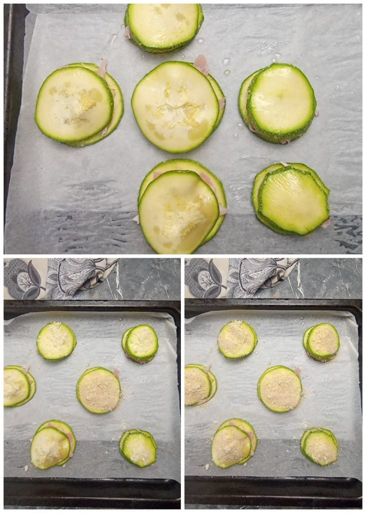 Na base das fatias de abobrinha, colocamos alguns pedaços de presunto cozido e alguns cubos de scamorza defumada.