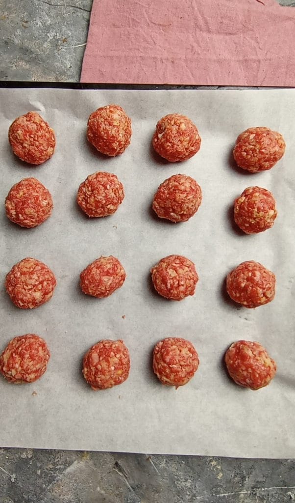 Eu não adiciono óleo, mas se quiser, pode colocar um pouco em cada almôndega.
