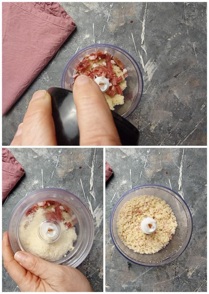 Para fazer as Almôndegas de carne com speck, primeiro, no mixer, junte o miolo de pão grosseiramente quebrado ao speck e ao queijo ralado e triture até obter uma consistência arenosa de todos os ingredientes.