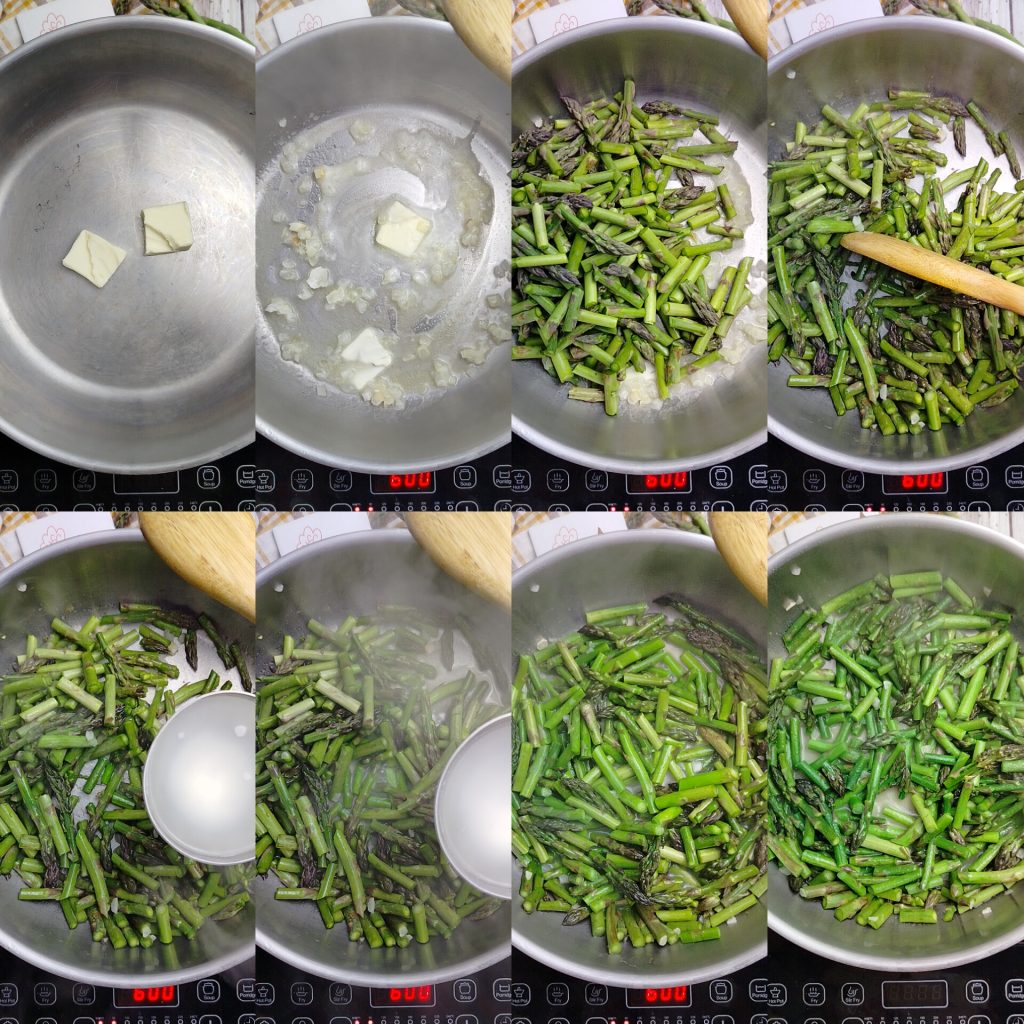 Em uma caçarola grande, refogue a cebola na manteiga e junte os aspargos, cozinhando por um minuto. Em seguida, acrescente duas conchas de água quente. Podem ser as da cocção do arroz. Cozinhe por 10 minutos.