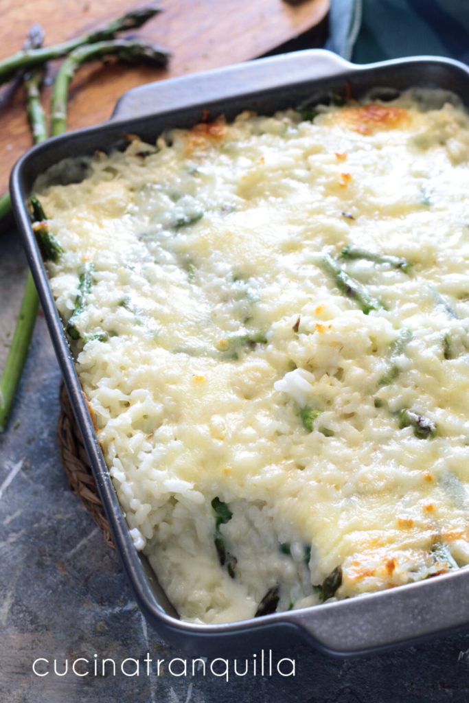 Arroz de forno sem lactose com aspargos, um prato principal super simples e saboroso, ideal para qualquer ocasião e perfeito para estes dias primaveris amenos. Ideal para fazer no forno ou na fritadeira sem óleo; para completar esta receita você vai precisar de molho bechamel sem lactose feito em casa ou comprado e de aspargos tenros e pequenos para um cozimento mais rápido e uniforme. Para a escolha do arroz eu recomendo usar aquele apropriado para assados de arroz. Entre os mais indicados estão o Arborio e o Carnaroli. Abaixo deixo outras minhas receitas para preparar pratos gratinados e, ao final da receita, responderei às perguntas mais comuns sobre esse tipo de preparo.