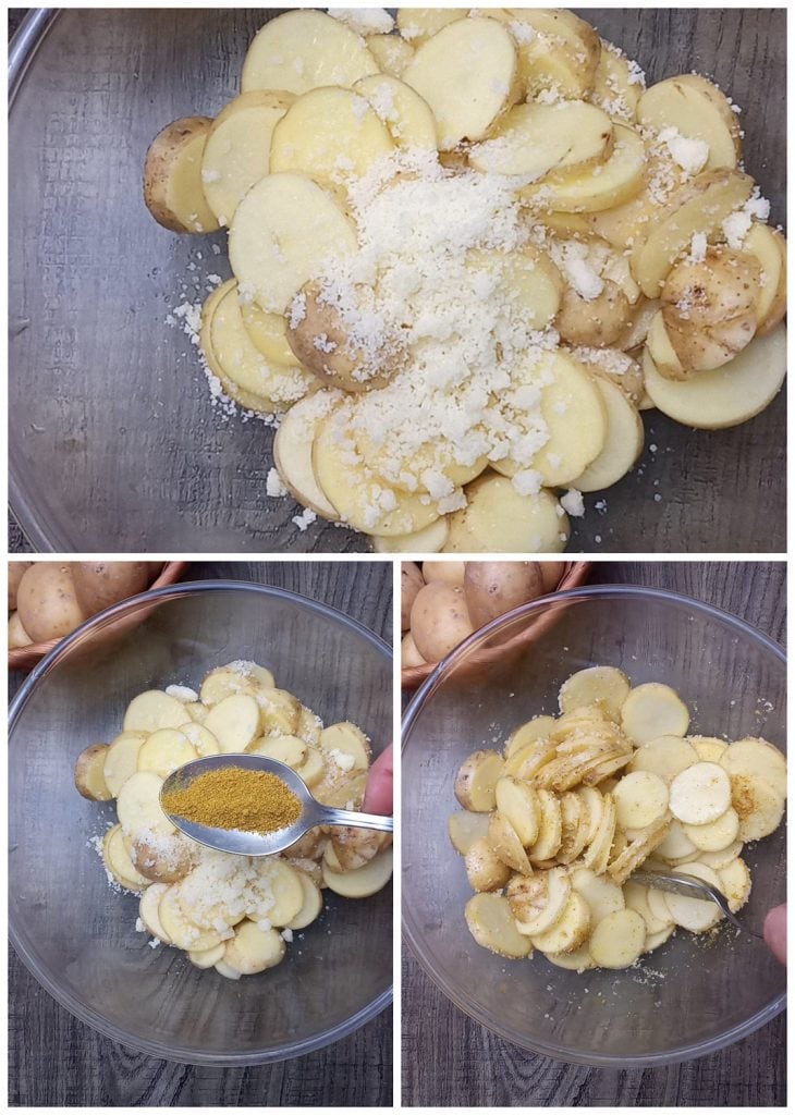 Despeje a manteiga sobre as batatas, adicione o queijo ralado, uma pitada de sal e a colher de chá rasa de curry. Misture muito bem.