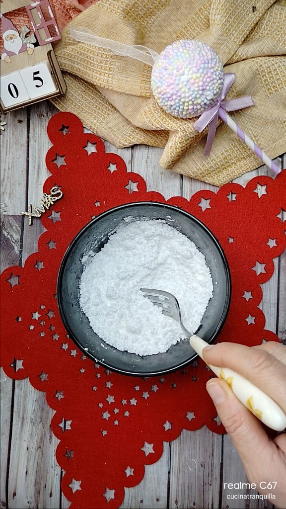 Retire os biscoitos e deixe-os esfriar. Enquanto isso, você pode preparar o glacê. Em uma tigelinha, coloque o açúcar de confeiteiro e elimine eventuais grumos.