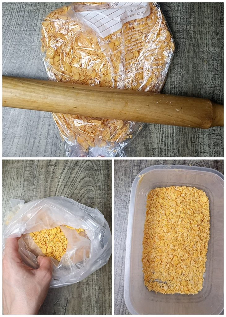 Você pode colocar os corn flakes em um saco de congelamento, fechá-lo e triturá-los com a ajuda de um rolo de massa.