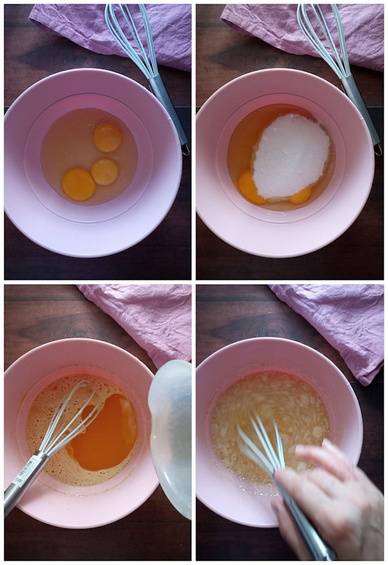 Para fazer o Bolo com geleia de frutas vermelhas, primeiro misturamos os ovos com o açúcar, até obter uma mistura clara e espumosa.