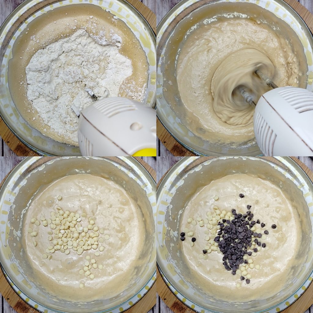 Misture primeiro com o batedor desligado e depois ligue-o para misturar bem os ingredientes, batendo por 3-4 minutos. Adicione as gotas de chocolate e misture com uma espátula.